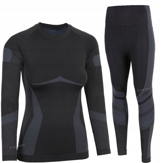 Komplet damskiej bielizny termoaktywnej w bezszwowej konstrukcji, wykonanej z szybkoschnącego, odprowadzającego wilgoć materiału, który pomaga w utrzymaniu stałej temperatury ciała podczas wzmożonego wysiłku.