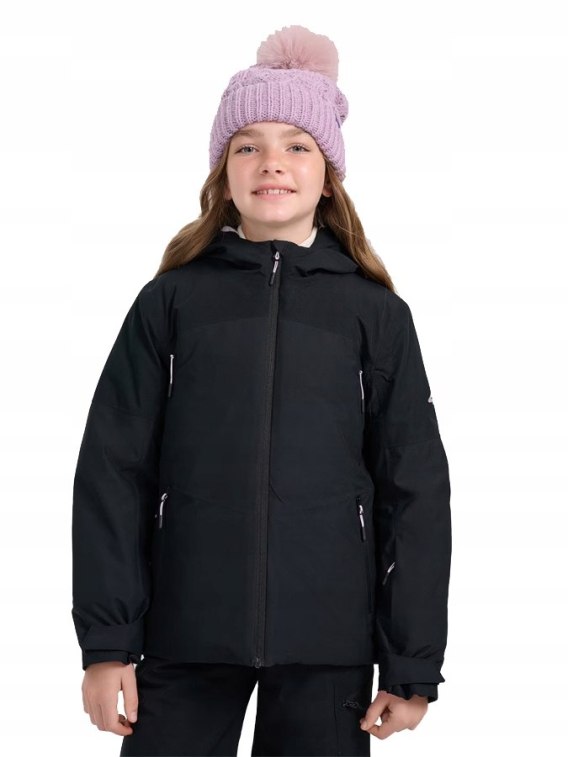 Dziewczęca kurtka narciarska z kapturem technologicznie dostosowana do sportowych aktywności oraz do codziennego użytkowania. Posiada krój regular, który wygodnie dopasowuje się do sylwetki oraz standardową długość sięgającą do linii bioder.