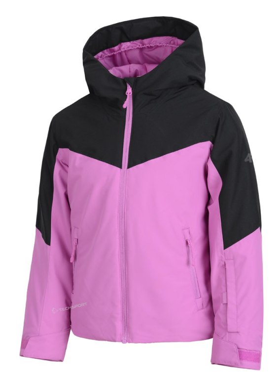 Dziewczęca kurtka narciarska z kapturem technologicznie dostosowana do sportowych aktywności oraz do codziennego użytkowania. Posiada krój regular, który wygodnie dopasowuje się do sylwetki oraz standardową długość sięgającą do linii bioder.