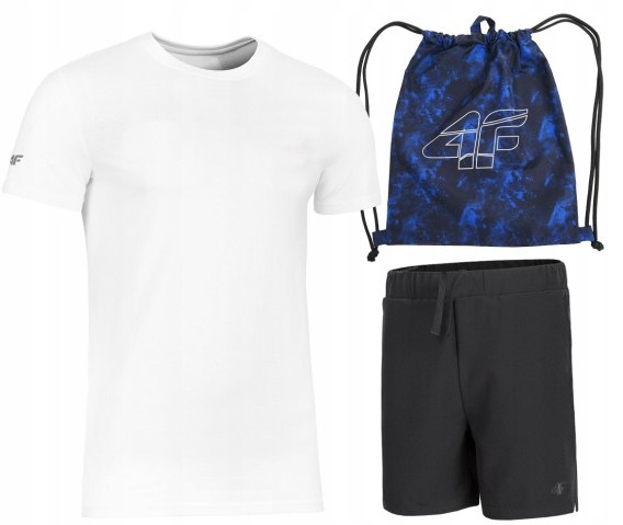 Chłopięcy, termoaktywny komplet sportowy firmy 4F. Zestaw zawiera koszulkę w kolorze białym, czarne spodenki i niebieski worek, który może służyć również jako plecak. Bardzo dobry materiał i wysoka jakość wykonania gwarantuje wygodę i długotrwałe użytkowanie.