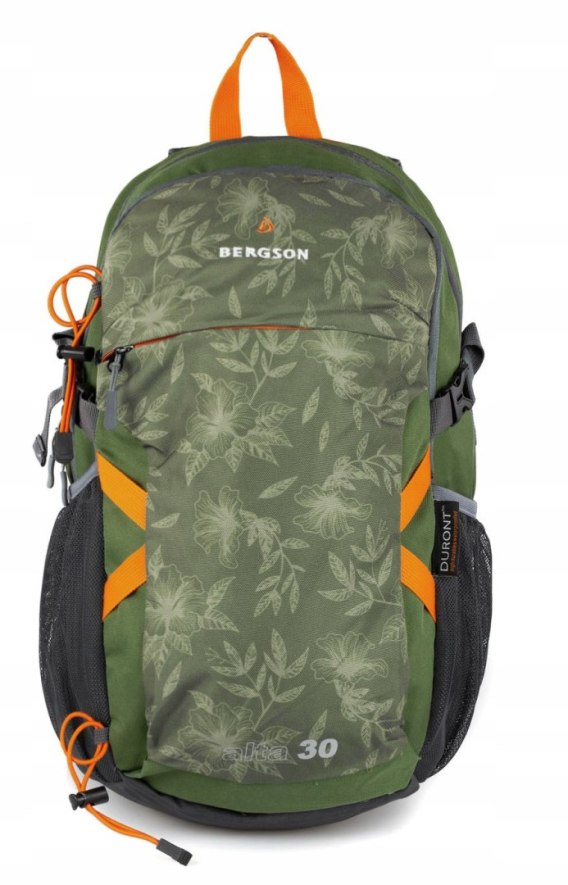 Komfortowy pojemny plecak firmy BERGSON o uniwersalnym zastosowaniu. Model Alta 30 sprawdzi się zarówno podczas wycieczek w góry oraz jako plecak miejski czy plecak szkolny. Posiada wygodny "oddychający" pas piersiowy (rozciąga się podczas oddychania, niwelując nieprzyjemne uczucie nacisku na klatkę piersiową), stabilizujący plecak na ramionach. Dzięki dodatkowej płaskiej kieszeni wewnątrz plecaka można transportować wygodnie laptopa. Plecak posiada również możliwość przytroczenia kijów. Dzięki systemowi nośnemu AIR IN-VENT SQ-MESH® z anatomicznie ukształtowanymi szelkami w kształcie litery "S", plecak bardzo dobrze się nosi, jest wygodny i nawet po długiej wędrówce nie będziemy czuć zmęczenia. Bardzo solidnie wykonany i dobrze wykończony - dopracowany każdy szczegół. Wykonany z najwyższej klasy materiałów: Duront® - bardzo wytrzymała, a zarazem lekka tkanina. Dzięki użyciu siatki AIR-MESH na szelkach oraz na poduszkach systemu nośnego, plecak umożliwia swobodną cyrkulację powietrza. Plecak charakteryzuje się dużą stabilnością oraz umożliwia komfortową eksploatację nawet w ciężkich warunkach przy dużych obciążeniach.