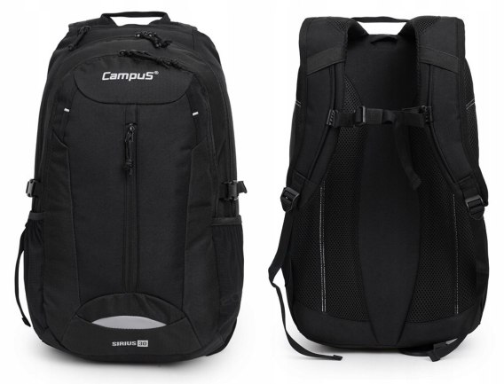 Wysokiej jakości markowy plecak miejski firmy Campus. Model "Sirius 30" idealnie nadaje się na wycieczki, do szkoły lub jako plecak do codziennego użytku. Dzięki zaawansowanemu systemowi nośnemu CDS w połączeniu z systemem wentylacyjnym Air-Con i anatomicznie ukształtowanymi szelkami, plecak bardzo dobrze się nosi, jest wygodny i nawet po długiej wędrówce nie będziemy czuli zmęczenia. Posiada jedną główną komorę z dużym otworem załadunkowym wraz z płaską kieszenią na bukłak, dodatkową mniejszą komorę na drobniejszy sprzęt z organizerem oraz pojemną przednią kieszeń. Solidnie wykonany, dobrze przemyślany i wykończony - dopracowany każdy szczegół. Wykonany z wysokiej jakości materiałów typu: Poliester RIP STOP oraz Poliester 600D. Materiał ten charakteryzuje się bardzo dużą odpornością na przetarcia i rozdarcia. Plecak posiada uchwyt do przenoszenia w dłoni, regulowane szelki wraz z wypełnieniem AIR-MESH oraz elementy odblaskowe zwiększające bezpieczeństwo. Plecak został przystosowany do montażu bukłaka - posiada wewnętrzną komorę na bukłak z wyprowadzeniem rurki na zewnątrz oraz uchwyty na szelce na rurkę. Pas biodrowy stabilizuje plecak na ramionach.